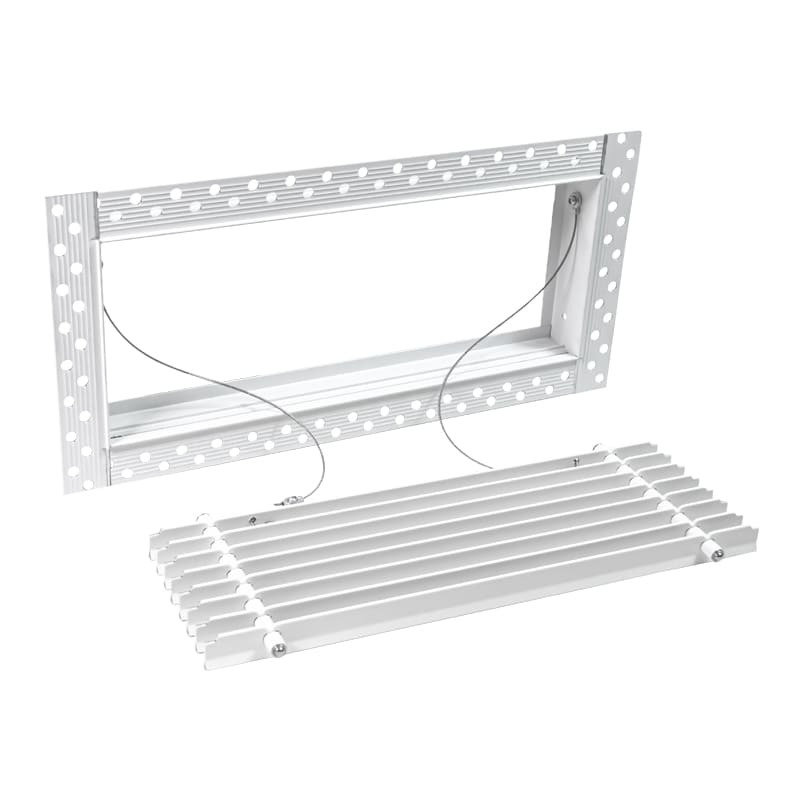 Данная решетка подходит для монтажа на любую поверхность под финишную отделку. Рамка и экран изготовлены из алюминия, опора экрана - из оцинкованной стали. Рама оснащена «полкой» 1,9 мм и рифлеными краями для большей адгезии финишного материала – шпатлевки, цемента. Решетка имеет съемную центральную часть с фиксированным углом наклона ламелей 0°. Она крепится к корпусу прочными металлическими тросиками, легко снимается для очистки и удобного обслуживания.