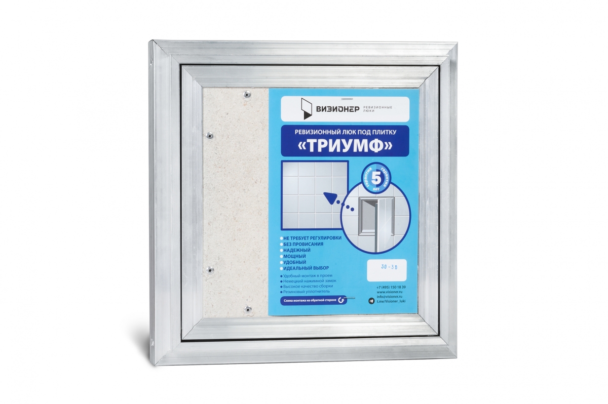 Рама люка для ревизии «Триумф» выполнена из алюминиевого профиля коробчатой формы и Г-образной в сечении для максимальной жесткости и удобства монтажа. Дверца люка изготавливается и алюминиевого профиля Т-образной формы, переменного сечения, с выраженными ребрами жесткости, что делает её конструкцию более жесткой в отличие от своих предшественников. Так как немаловажно исключить перекосы конструкции дверцы, чтобы не допустить деформации наклеенных на нее материалов. В отличие от наших конкурентов, толщина стенок алюминиевого профиля у нас по-прежнему 2 мм и более.