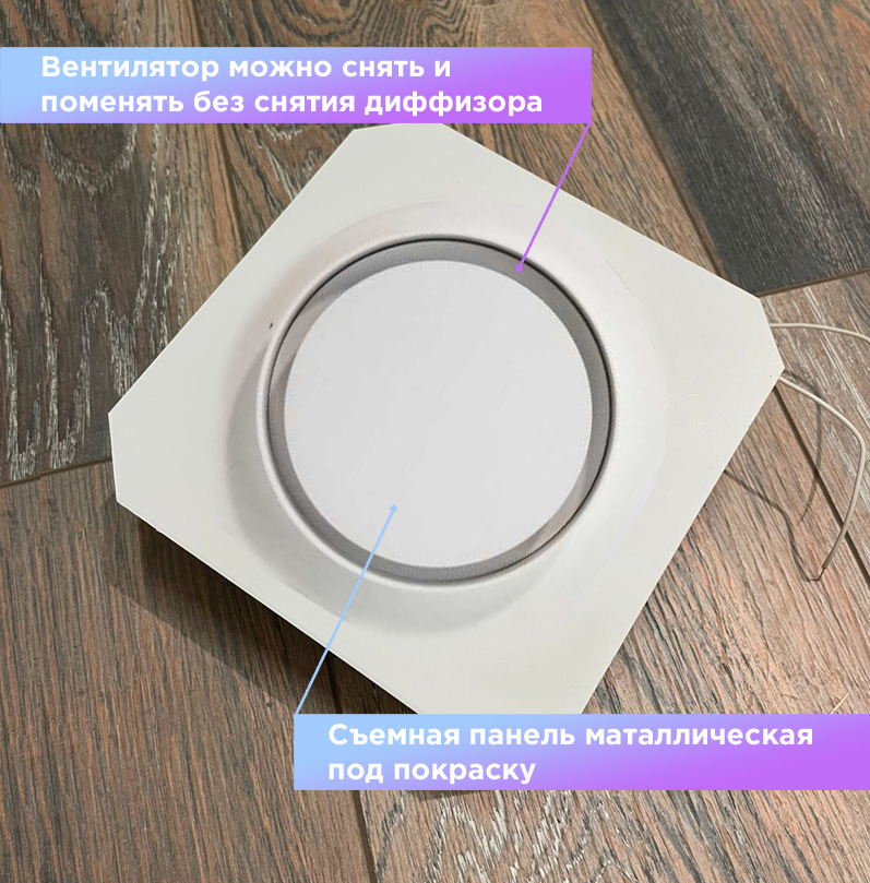 Так же диффузор состоит из металлической заслонкой, которой можно регулировать поток воздуха, либо полностью перекрыть его. К заслонке с помощью магнитов крепится декоративная круглая панелька, которую можно покрасить в цвет потолка. Так же по ободку диффузора имеется молярная сетка, для надёжной фиксации шпаклёвки. Наши диффузоры оснащены москитной сеточкой, которая препятствует попаданию насекомых в помещение.